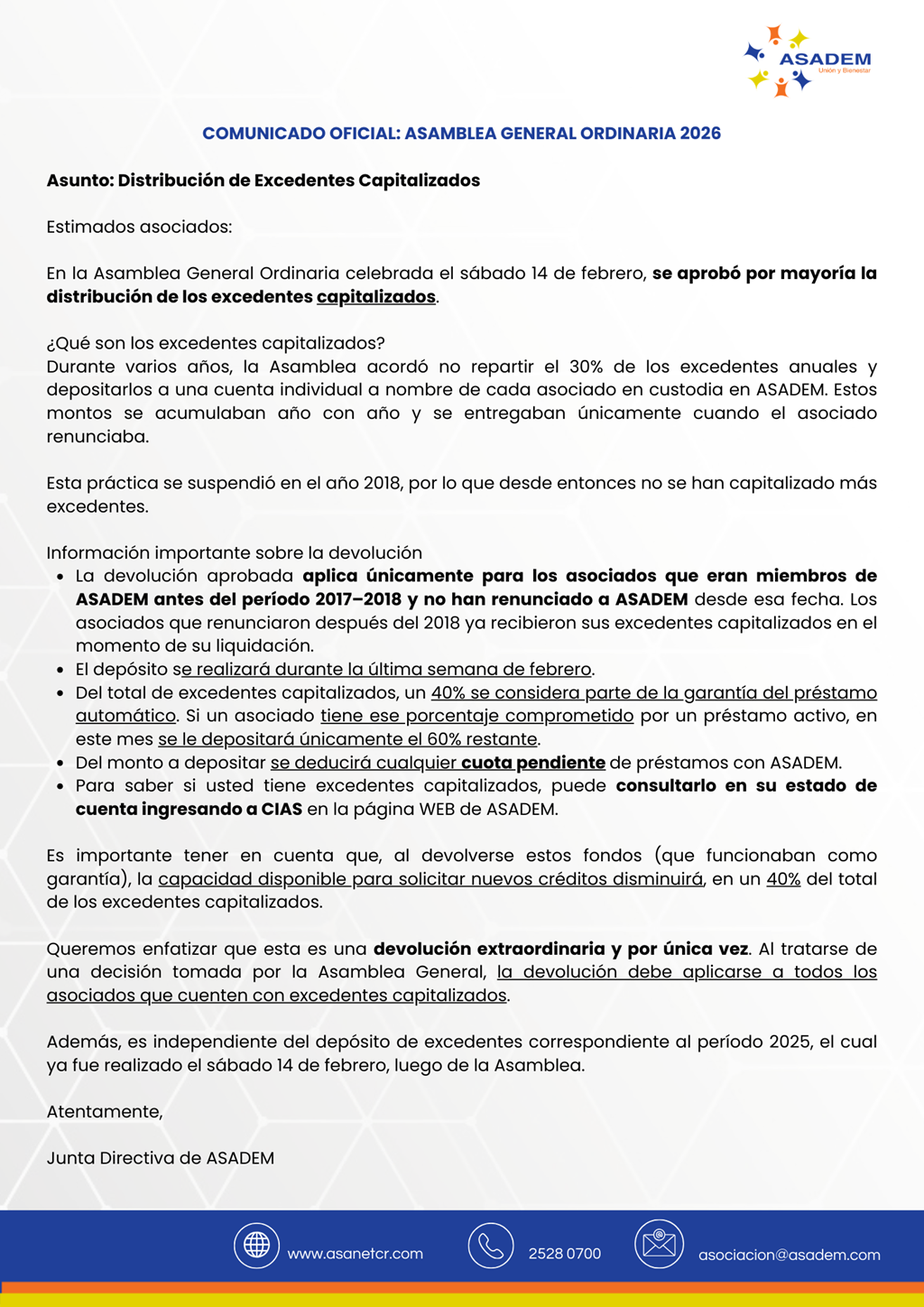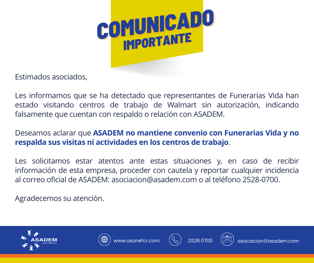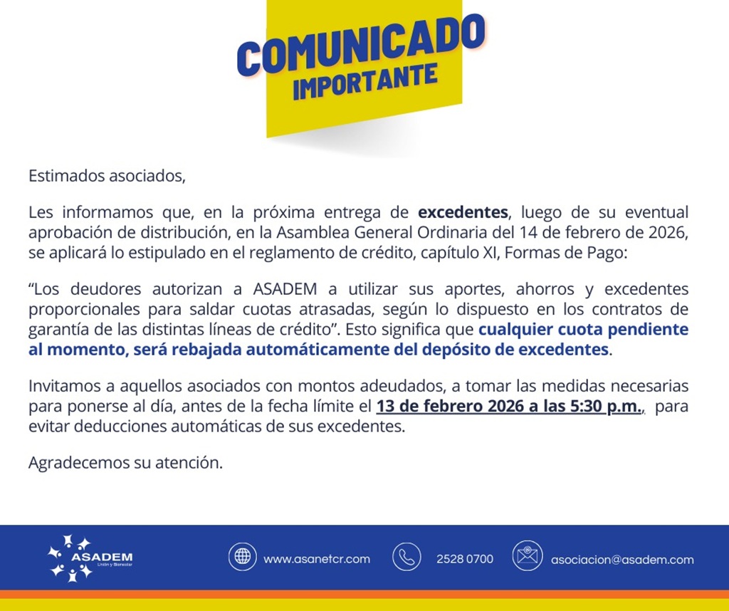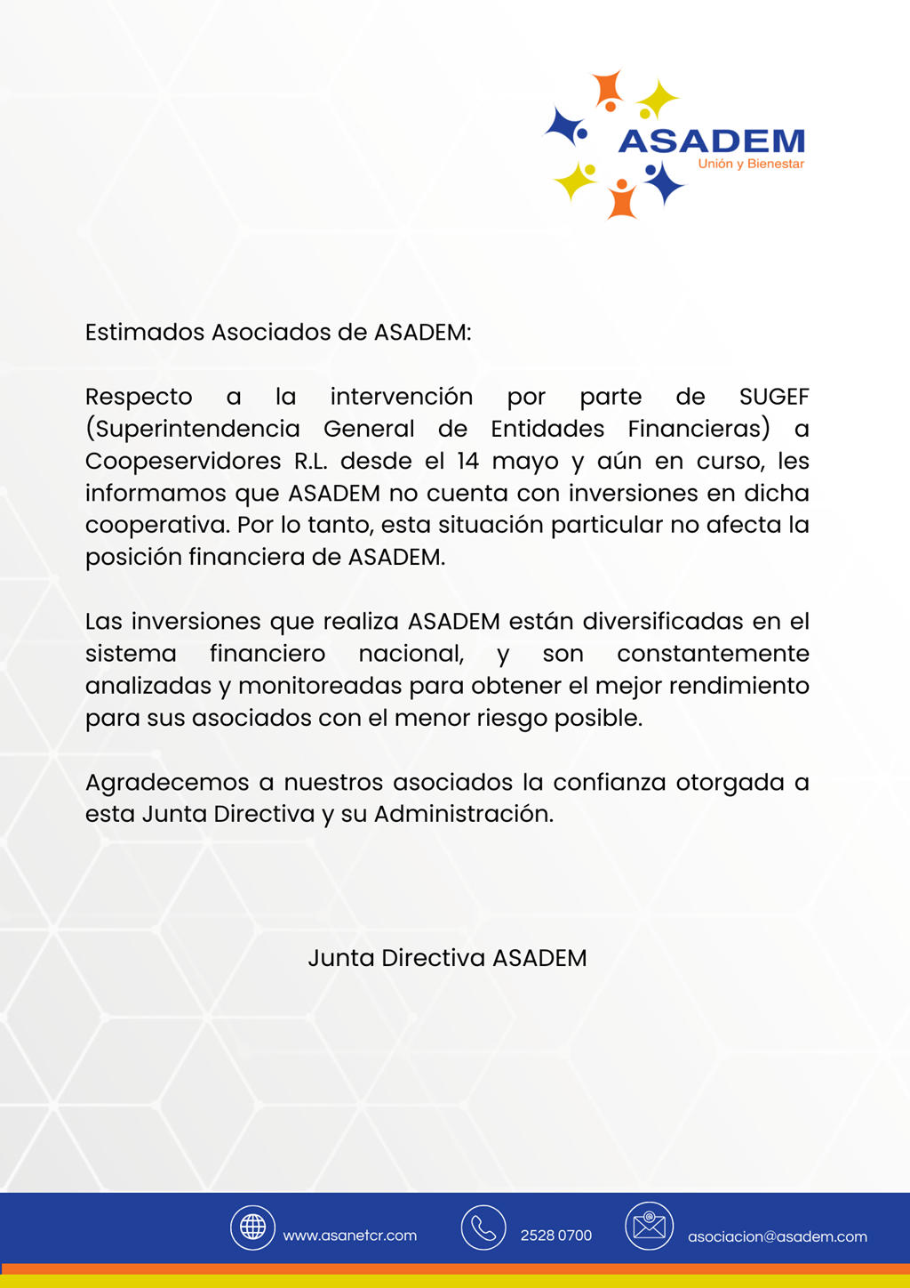 Se advierte al público que ASADEM es supervisada solamente en materia de prevención de legitimación de capitales, financiamiento al terrorismo y financiamiento de la proliferación de armas de destrucción masiva, y además se encuentra sujeta a disposiciones vinculantes de la Unidad de Inteligencia Financiera del Instituto Costarricense sobre Drogas. Por lo tanto, la Sugef no supervisa en materia financiera a ASADEM, ni los negocios que ofrece, ni su seguridad, estabilidad o solvencia.