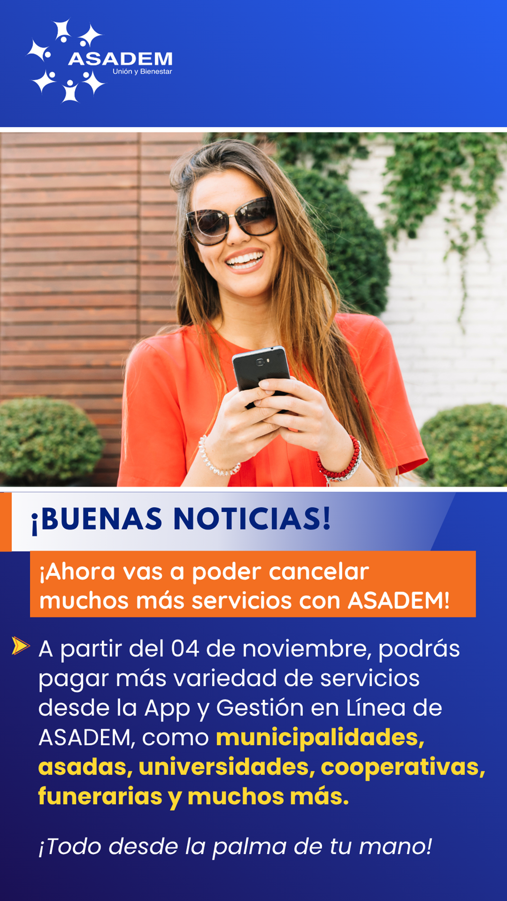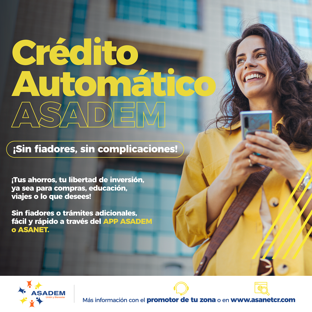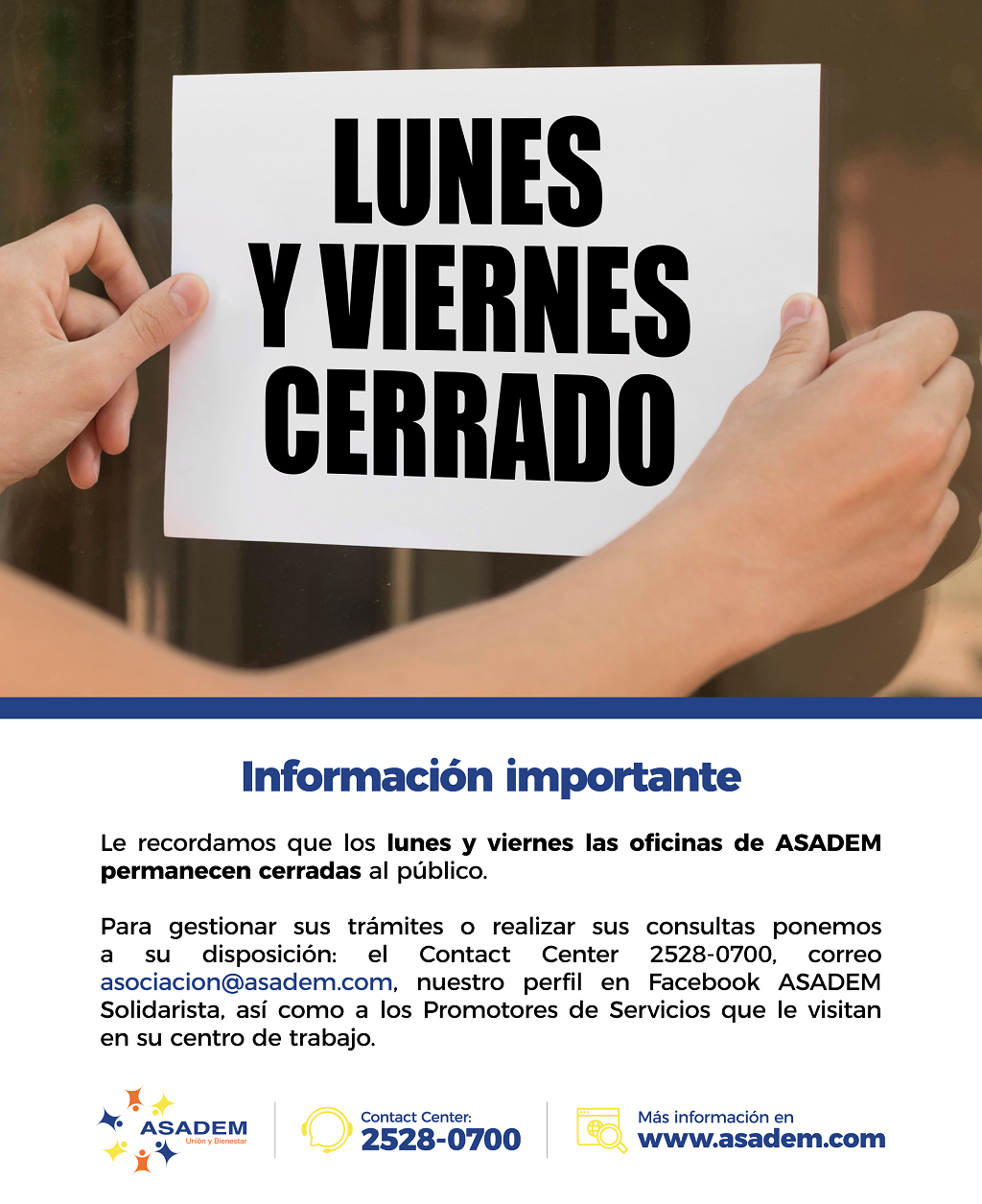 Se advierte al público que ASADEM es supervisada solamente en materia de prevención de legitimación de capitales, financiamiento al terrorismo y financiamiento de la proliferación de armas de destrucción masiva, y además se encuentra sujeta a disposiciones vinculantes de la Unidad de Inteligencia Financiera del Instituto Costarricense sobre Drogas. Por lo tanto, la Sugef no supervisa en materia financiera a ASADEM, ni los negocios que ofrece, ni su seguridad, estabilidad o solvencia.