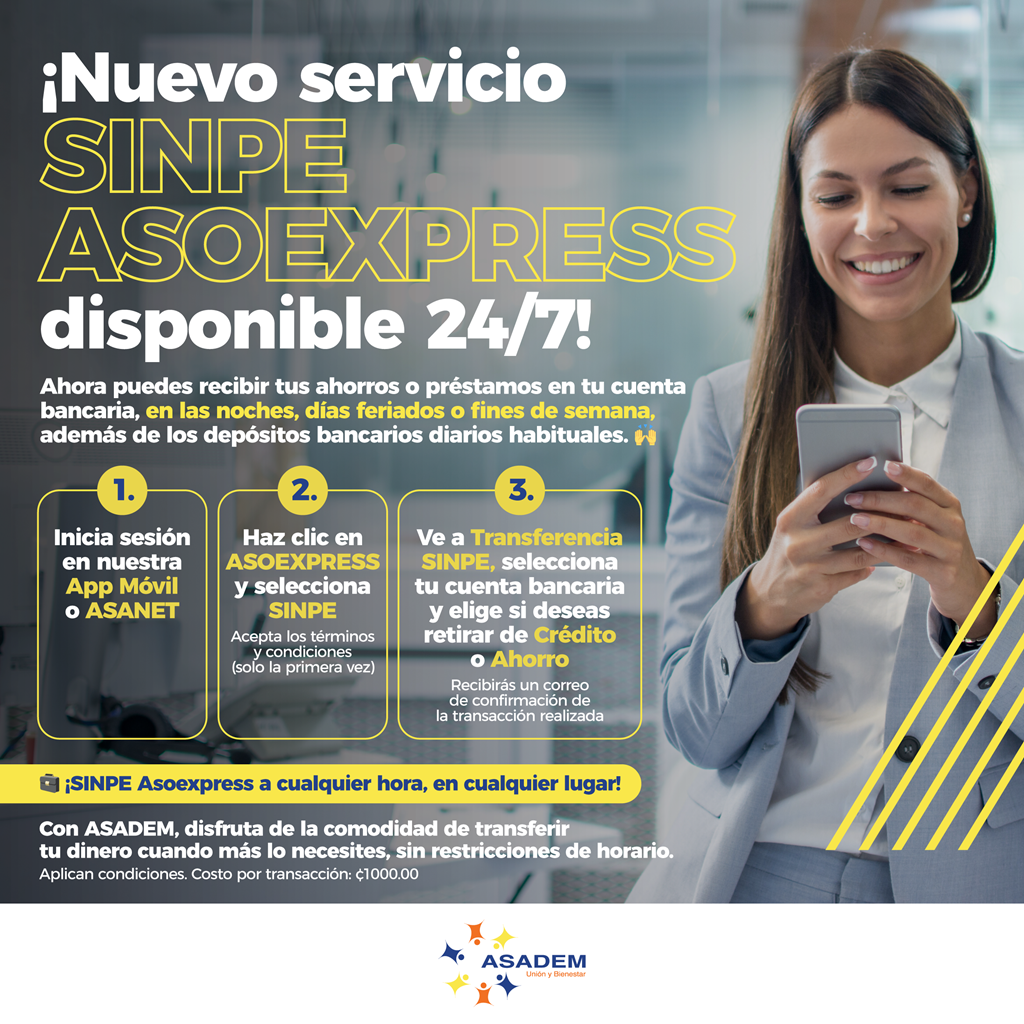💡¡Con SINPE Asoexpress, tu dinero siempre está a tu alcance, sin importar la hora o el lugar!