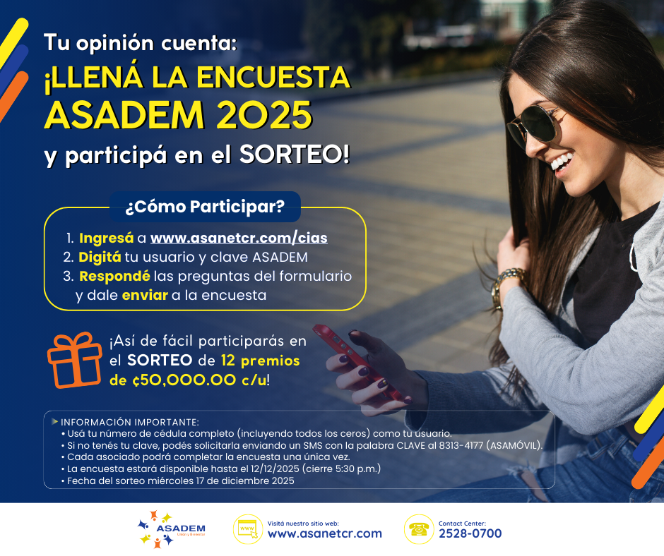 Llená la Encuesta ASADEM 2025 y participá en el sorteo de 12 premios de ₡50,000 c/u. 🎁